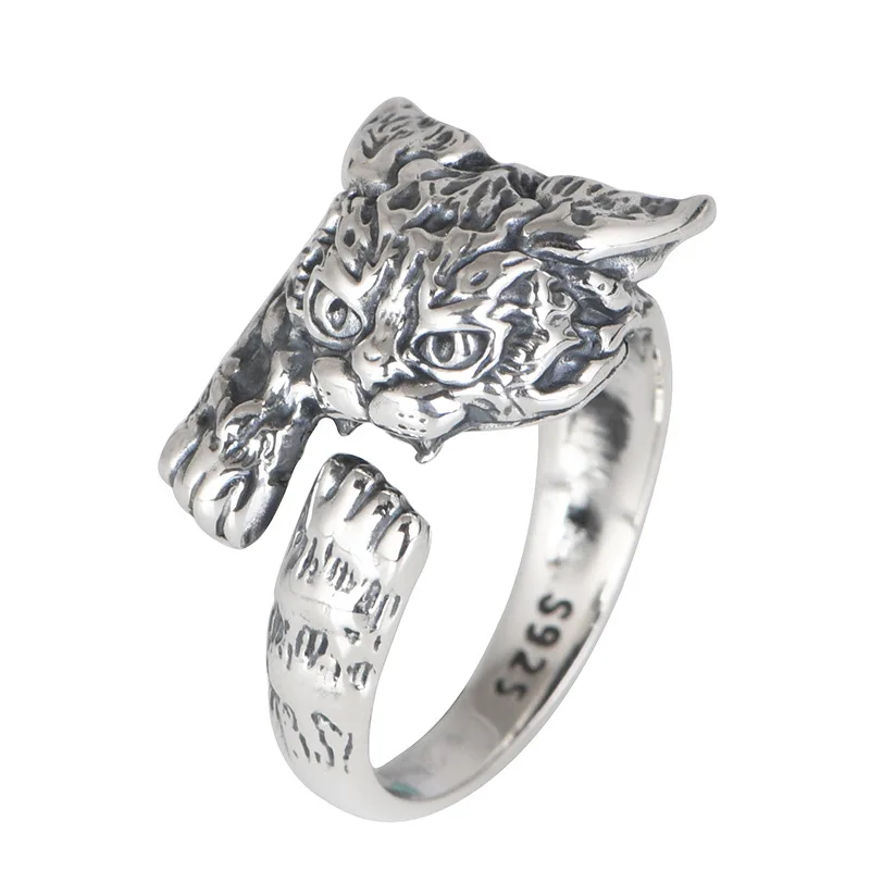 Real 925 Sterling Silver Cute Russian Cat Ring For Women Retro Personality Cartoon 3D High-end Jewelry
